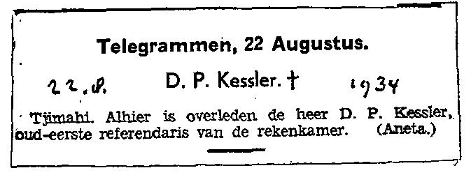 Old legal secretary passed away. From Tjimahi an Aneta telegram reports the passing away of mr D.P. Kessler, late first legal secretary of the general audit office.