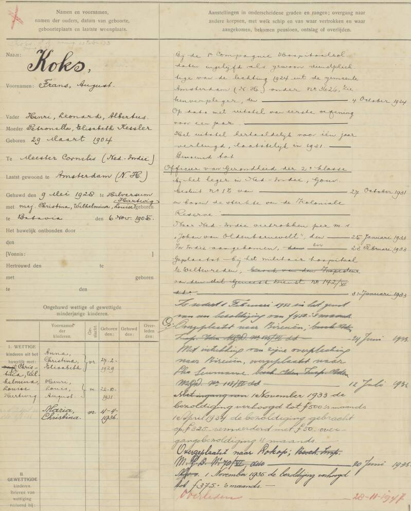 Frans was born on March 29, 1904 in Batavia as the son to Petronella Elisabeth Kessler and Henri Leonard Albertus Koks. Around his 20th he lived in the Netherlands (probably to study) and by conscription of 1924 in Amsterdam , he was placed at the 1st company of Field Hospital Soldiers. He married Christina Wilhelmina Louisa Hartwig in Hilversum, born in Batavia, on 9 May 1928. In 1933 the couple moved to the Dutch East Indies, where Frans was incorporated as a 2nd class health officer and placed at the military field hospital in Weltevreden. In the meantime, the couple children were born. They had: