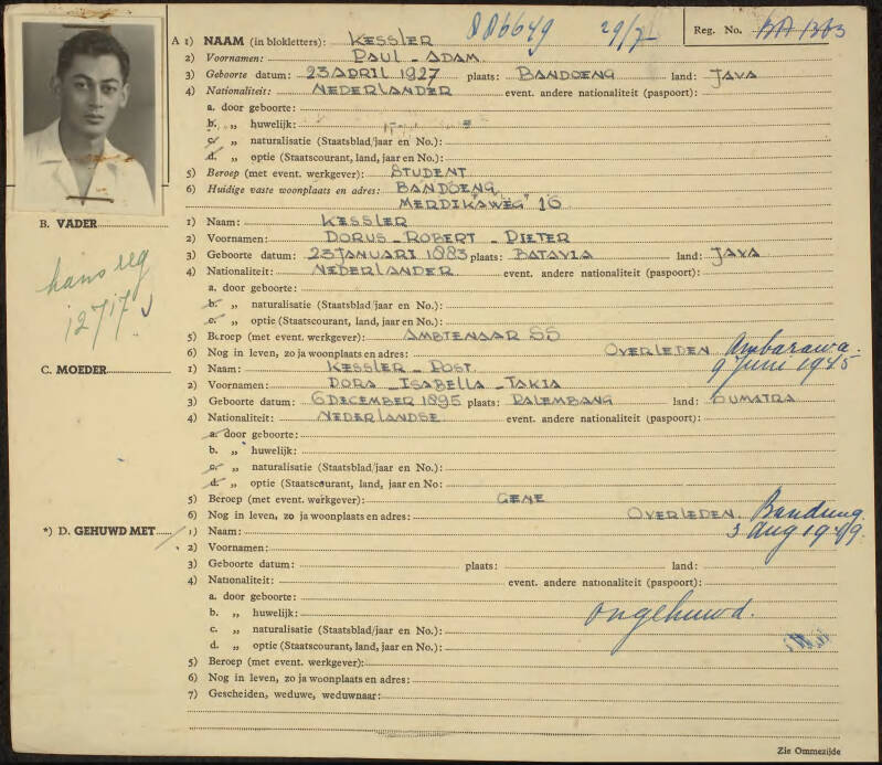 Paul Adam is geboren in 1927 te Bandung als zoon van Dorus Robbert Pieter Kessler en Dora Isabella Takia Post. Oom Paul en tante Lietje waren ook graag geziene mensen op de verjaardag van mijn grootouders. Ze kwamen uit Noord Holland. Het toeval wil dat tante Lietje ook familie had in Zaltbommel, waar wij woonden. Mijn vaders moeder Johanna Holtz, was in Zaltbommel bevriend met de indische mevrouw Pöttger. Tante Lietje was een van haar kinderen. Mijn vader kende de familie al sinds dat hij in 61´ in Zaltbommel kwam wonen. Hij had dezelfde leeftijd als Theo Pöttger, een jongere broer van tante Lietje. Ik ben er met mijn ouders vele jaren later zelf over de vloer geweest. Een aantal kinderen van oom Paul en tante Lietje was hier ook bij. Oom Paul is na de oorlog vanuit Java als DETA jongen naar Nieuw Guinea gekomen. Er heerste in Nieuw Guinea een groot tekort aan arbeidskrachten en daar moest de regering op korte termijn een oplossing voor bedenken. Hierop werd de Dienst Economische Technische Aangelegenheden opgericht. Meer dan duizend jongemannen van Indische afkomst werden geronseld voor de opbouw en ontwikkeling van Nieuw Guinea. De jongens moesten de Nederlandse nationaliteit hebben, niet jonger dan 18 jaar zijn, en een goede gezondheid bezitten. Men kreeg een contract van een jaar en de reis werd betaald. Huisvesting, eten en medische verzorging werd gratis verstrekt. Ze kregen anderhalve gulden per werkdag van acht uur. Op zaterdagen werd vijf uren gewerkt.