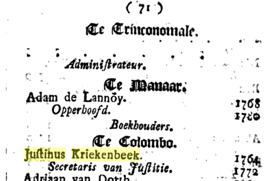 Justinus’ vader was Barent Kriekenbeek. Barent is geboren op 25 augustus 1712 te Colombo. Hij was een zoon van Rijcloff Kriekenbeek en Adriana Elisabeth Pluymert. Barent was in 1739 secretaris van de politie te Colombo. In 1756 werd hij benoemd tot onderkoopman. In 1760 was hij lid van den Landraad. Het jaar daarop opzichter van het ijzermagazijn. In 1762 was hij secretaris van justitie. Hij ging op 26 november 1771 met pensioen en overleed in 1778. Barent trouwde Catherina Ritmeijer. Samen kregen zij zes kinderen. Maria Susanna werd als eerste geboren. Adriana Elizabeth volgde in 1735.