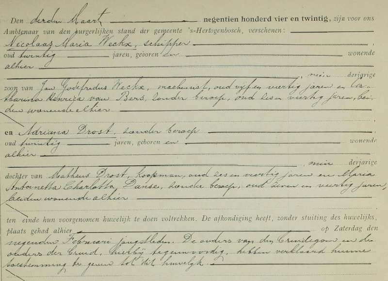 Hij trouwt op 3 maart 1924 te 's-Hertogenbosch Adriana Drost.