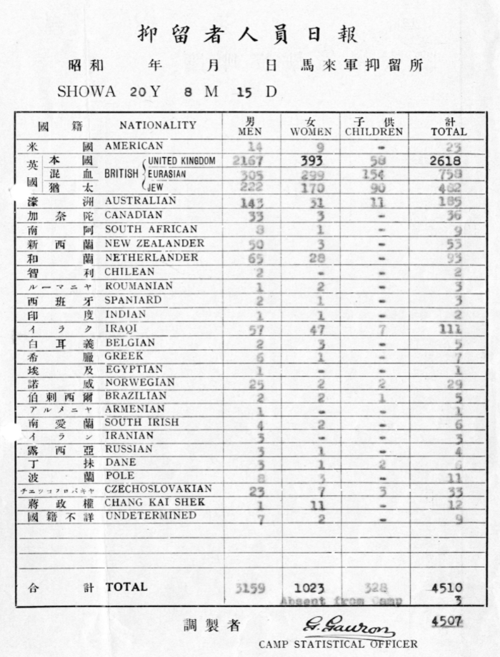 On December 7, 1941, Japan invades Singapore. Singapore falls on February 15, 1942. Robert Andrew was in the Sime Road Japanese internment camp in Singapore, wearing camp number 1205. He was there with his Malacca-born wife and their 5 firstborn children. She wore camp number 1204. The camp commander of the Sime Road internment camp was Major General Saito. In this former RAF camp, each nationality had its own barracks. This camp was in use from December 1943 to May 1944. The camp was divided between women and their children, and men over 12 years old. In the latter part of the Japanese occupation, the camp consisted mainly of prisoners of war of English and European descent. Growing vegetables kept beri-beri in check, but Malaria and typhoid were endemic. Sime Road Camp had a total of 4,507 internees of 27 nationalities during the liberation. 1,023 of these were women and 328 children. The majority were of British descent. 758 internees were of European descent. The inmates of Sime raod camp generally had a slightly better time than the other internment camps, despite this many people died. After the capitulation of the Japanese, the internees were requested to remain in the camp for their own safety. Some had no choice because their homes had been seized by soldiers.