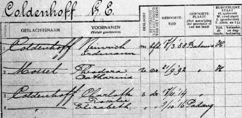 On September 20, 1892, Petronella Kesler and Martinus Theodorus Mossel reported the birth of a daughter in Batavia, named Theodora Catharina, through an advertisement in the newspaper. This daughter married Heinrich Erdmann Coldenhoff, administrative officer, inspector, 1st class, in Batavia on December 12, 1913. They had two daughters. In 1929 the family goes on a long leave of absence. Daughters Charlotte Rosalie and Elisabeth, born in Padang, are introduced to cold Holland. In 1930 the family is registered in The Hague in the Obrechtstraat at number 302, and a little later in the Valeriusstraat at number 55.